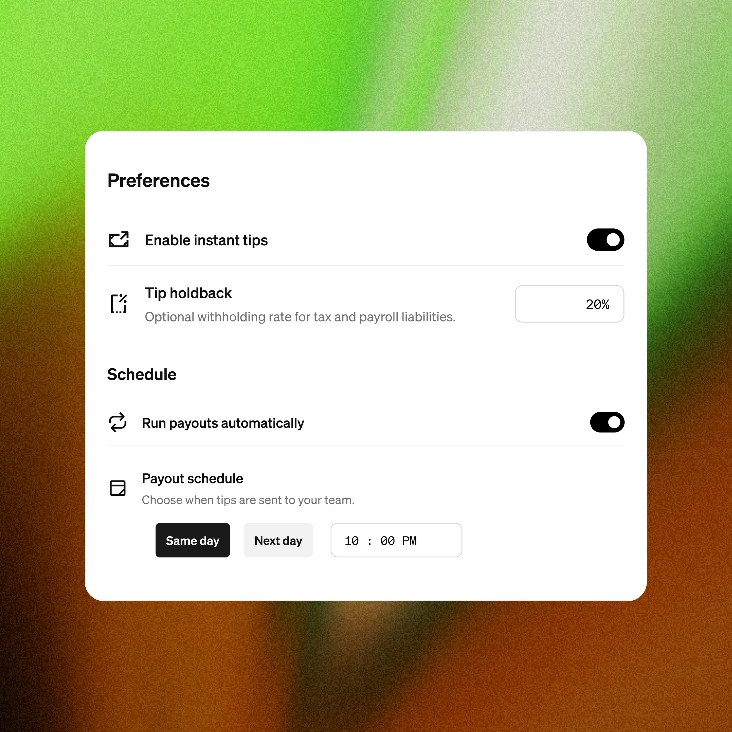 Configure how payouts work — Let sellers set timing, preview settlement, and choose distribution modes.