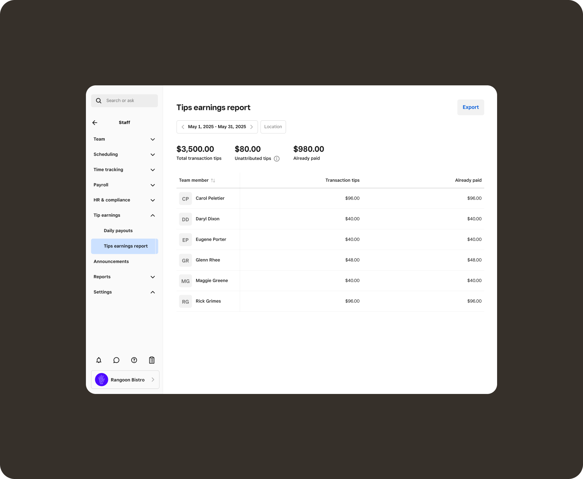 Many sellers still pay out tips in cash at the end of each shift, a manual process that’s time-consuming, error-prone, and operationally risky.