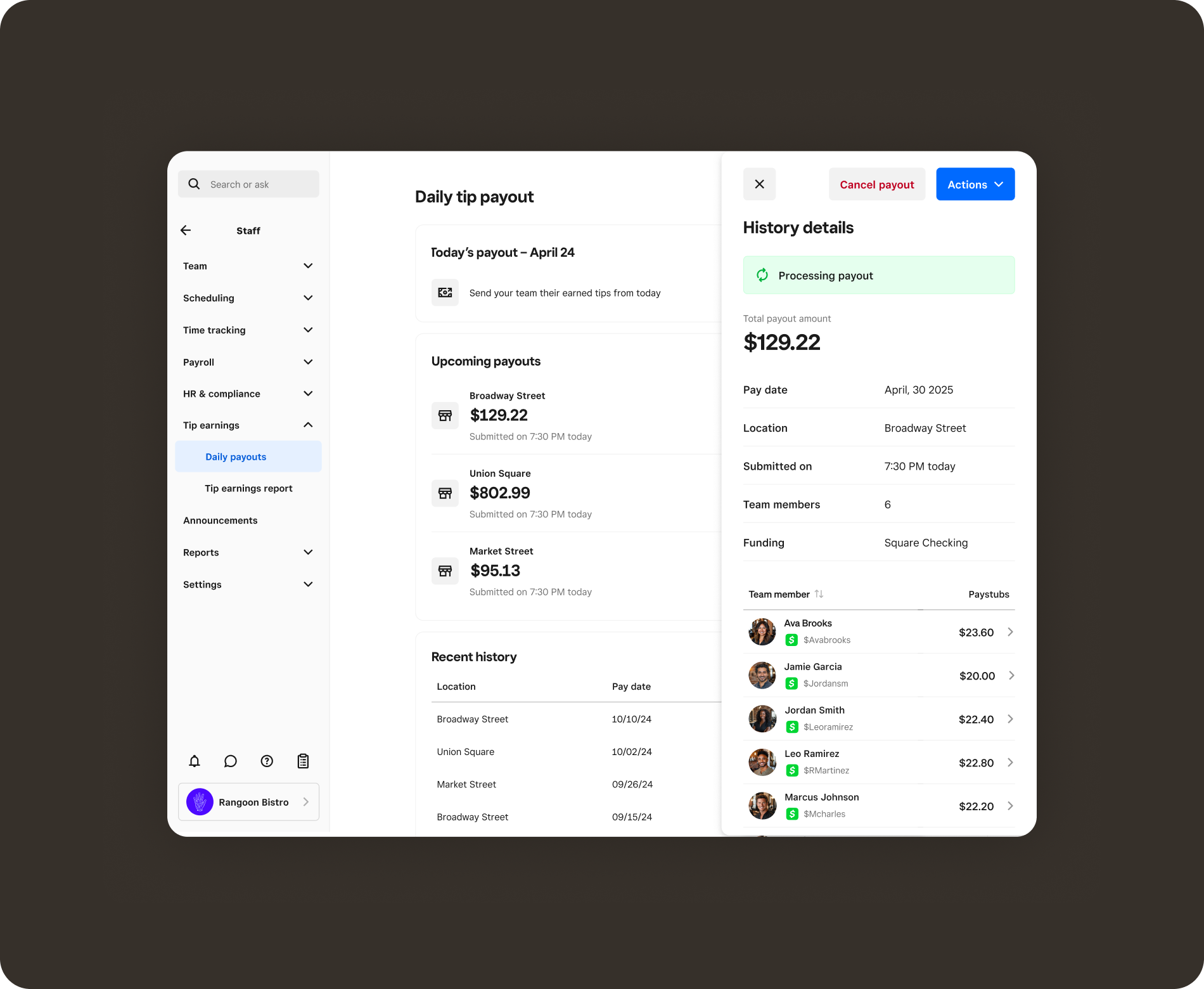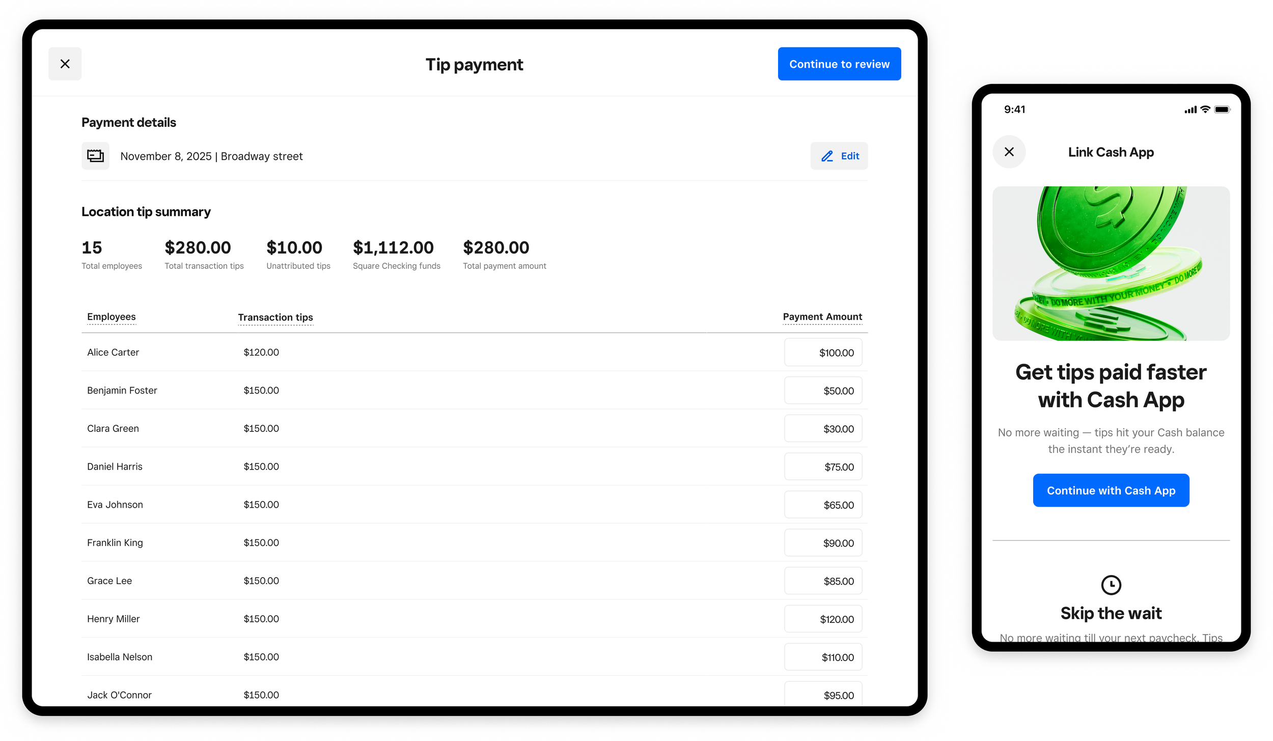 We built Daily Tip Payouts to Cash App — a new flow in Square Dashboard that lets sellers review, manage, and send digital tip payouts at the end of each shift. Tips appear instantly in each employee’s Cash App balance, ready to spend, save, or transfer.