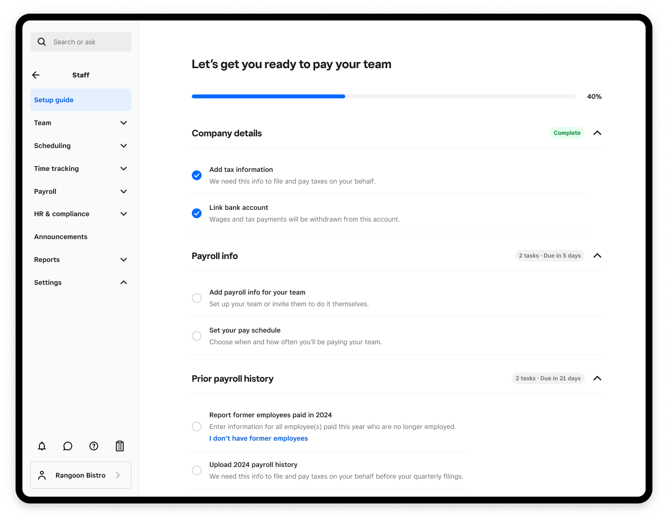 We created the Staff + Payroll Setup Guide — a task-based onboarding experience that personalizes setup based on each seller’s business type, workforce, and compliance requirements.